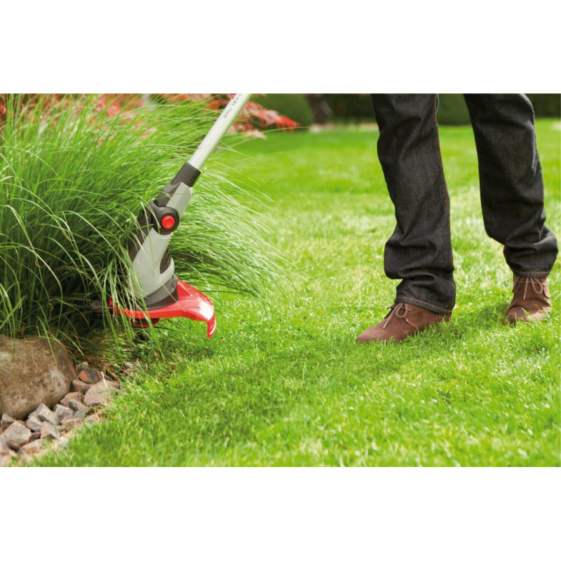• A 180 fokban elforgatható és dönthető, 30 cm-es vágásszélességű rugalmas damilfej, valamint a növényvédő rúd ideálissá teszi a készüléket a pázsit szélén, bokrok alatt, padkánál és falaknál történő precíz nyíráshoz.
