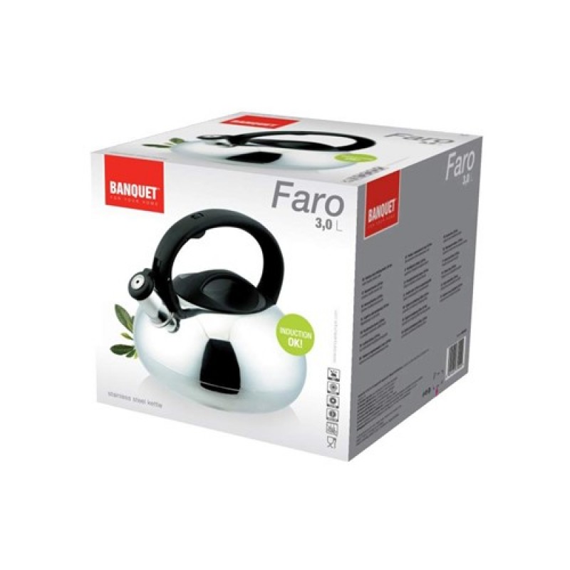 Banquet FARO Teáskanna, acél, 3 lA Banquet FARO Teáskanna kiváló minőségű műanyag fogantyúval és rozsdamentes acél borítással rendelkezik. Minden típusú főzőelemen használható (kerámia, indukciós, elektromos), 3 literes kiszerelésének köszönhetően nagy mennyiségű folyadék felforralására alkalmas. Fényes, színes felülete tökéletes kiegészítőjévé válhat konyhájának!