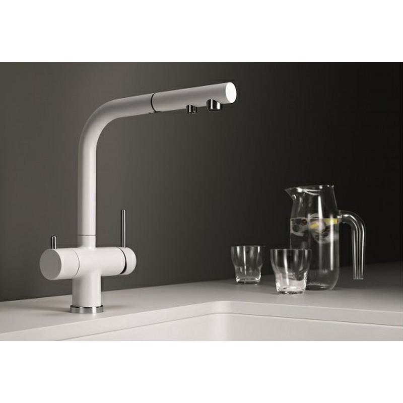 • Kényelmes 3 az 1-ben csaptelep: szűrt és szűretlen víz a kihúzható tömlőből
