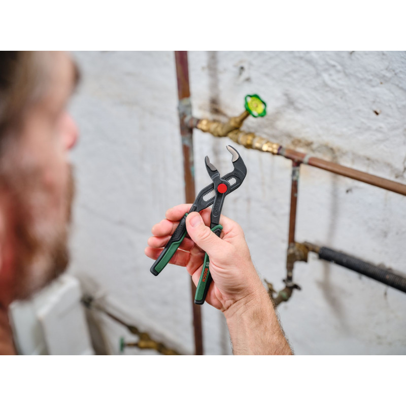 A Bosch 180 mm-es vízpumpafogója masszív szerszám a barkácsoláskor felmerülő vízvezeték-szerelési és szorítási feladatokhoz. Sokoldalú fogó 19 beállítási fokozattal a különböző méretű csövek fogásához. Nyomógombos beállítás 40 mm-es maximális pofanyílásig. Kompakt kialakításának, kis súlyának és keskeny, ergonomikus, puha markolatú nyeleinek köszönhetően stabil teljesítményt és egyszerű használatot biztosít – még a szűk helyeken is. A fogó tartós, edzett szénacélból (60 ± 2 HRC) készült, és fekete foszfátbevonattal rendelkezik – így strapabíró és tartós szerszám. A fogó megfelel az ISO 8976 és az ISO 5743 szabvány előírásainak.