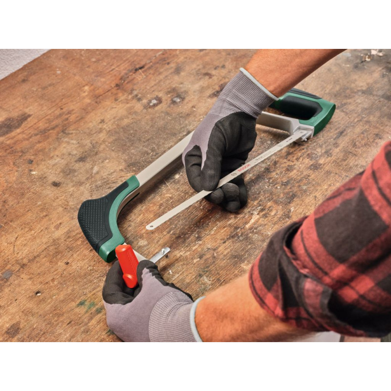 BOSCH Fémfűrész 300 mm (1600A02ZA8) univerzális keretes fűrész, amely alkalmas fém, műanyag és fa vágására. Tartós 300 mm-es bimetál fűrészlappal van felszerelve, amelynek finom osztása 24 TPI, így tiszta és pontos vágást biztosít. A fogak keménysége 62–68 HRC között hosszú élettartamot garantál intenzív használat mellett is.