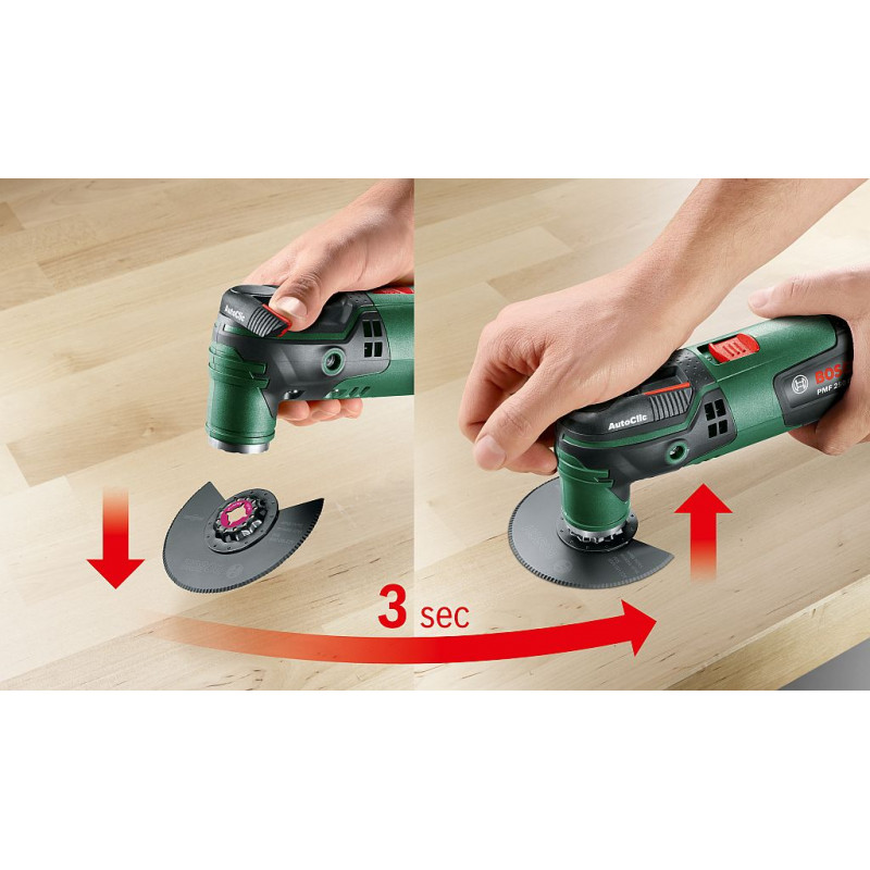 Ez a sokoldalú univerzális szerszám számos barkácsfeladathoz tökéletes választás. A 250 W-os motor gondoskodik a szükséges teljesítményről, míg az elektronikus fordulatszám-előválasztás lehetővé teszi az anyagnak megfelelő munkavégzést. Az opcionális Starlock tartozékok széles választékának köszönhetően változatos feladatokhoz használható, míg a Bosch AutoClic rendszerrel a tartozékok gyorsan és egyszerűen, 3 másodperc alatt cserélhetők. Az oszcilláló PMF 250 CES multifunkcionális szerszám alkalmas fa, fém, műanyag, gipszkarton, habarcs és vakolat vágására, fűrészelésére, csiszolására, hántolására, marására, reszelésére és polírozására. A porelszívó tartozék segítségével tisztábban tartható a munkaterület.