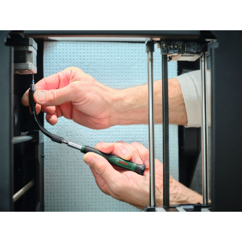 Kisméretű elektronikus eszközök, szemüveg, laptop és órák gyors és hatékony szerelése a minőségi Bosch precíziós csavarhúzókkal (20 részes készlet). Precíziós bittartós csavarhúzó keskeny és ergonomikus kialakítással, puha markolatú nyéllel és forgatható kupakkal a hatékonyabb használat és a nagyobb kényelem érdekében. Könnyű és gyors forgatást tesz lehetővé, miközben optimális erőt biztosít a kontrollált és precíz csavarozáshoz. A bitek szorosan a helyükön maradnak a szárban az erős mágneses bitbefogónak köszönhetően. A fogantyú hatszögletű vége megakadályozza az elgurulást. A készlet tartalma: 20 precíziós bit (PH000/00/0, SL1.5/2/2.5, TX2/3/4/5/6, TH8, HEX1.5/2, U2.6, Y1, Pentalobe 0,8/1,2, Triangle 2/2,3), hagyományos toldószár, rugalmas toldószár, praktikus csipesz a finom fogási feladatokhoz. Praktikus műanyag tokkal az egyszerű tárolás és szállítás érdekében.