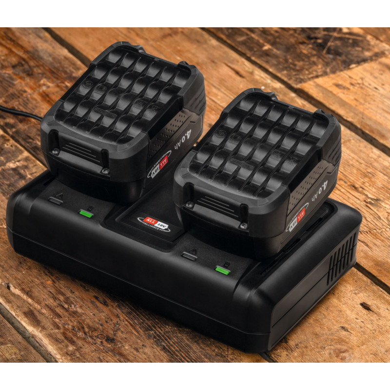 - A 2 db 18 V-os akkumulátor 36 V-os teljesítményt és hosszabb üzemidőt biztosít