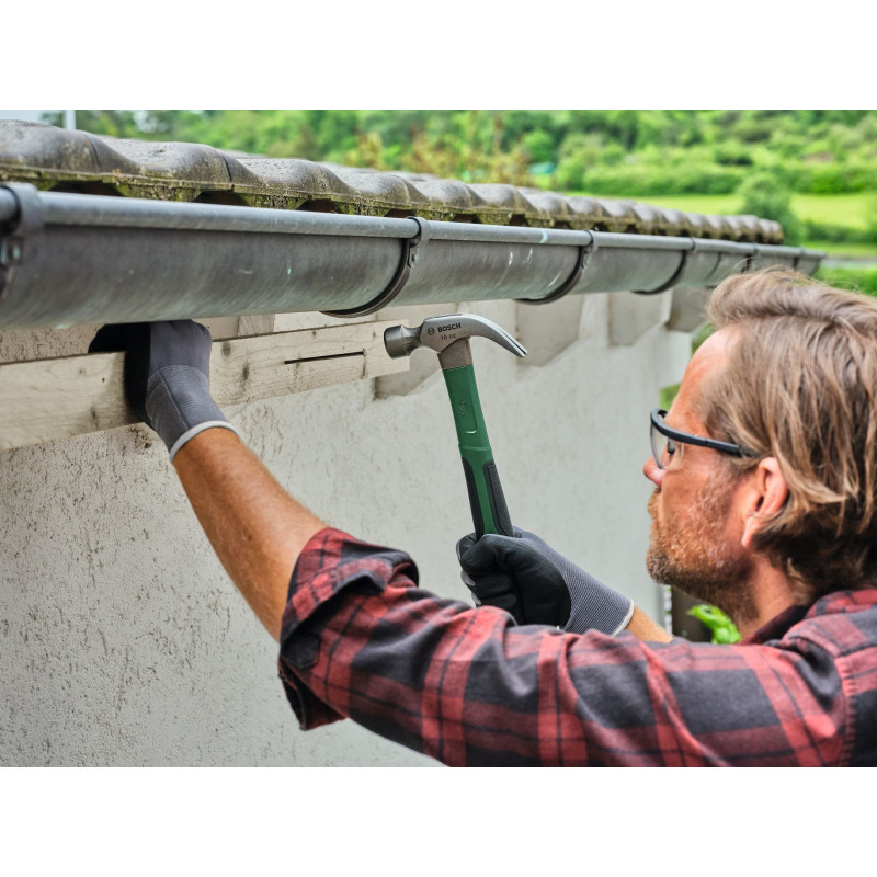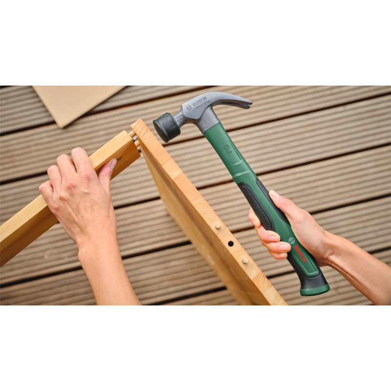 Érdemes a műhelyben tartani egy Bosch 450 g-os (16oz) körmös szeghúzó kalapácsot az erőteljes kalapácsoláshoz és sokféle barkácsmunkához. Ez a többféle feladatra használható szerszám tökéletes társ mindenféle faszerkezet szegezéséhez és a szegek kihúzásához. Kemény szénacélból (50-58 HRC) készült, üvegszál-erősítésű maggal, nagy erőkifejtést és ütési hatékonyságot tesz lehetővé minimális rezgéssel. A fej matt bevonata növeli a rozsda elleni védelmet és hozzájárul a hosszú élettartamhoz. A beragadt szegek könnyed eltávolításához robusztus, lefelé hajlított, V alakú körmökkel rendelkezik. Minden feladatot nagyobb kényelemmel és jobb fogással segít az ergonomikus, gumírozott dinamikus nyélnek és a kiegyensúlyozott fejnek köszönhetően.