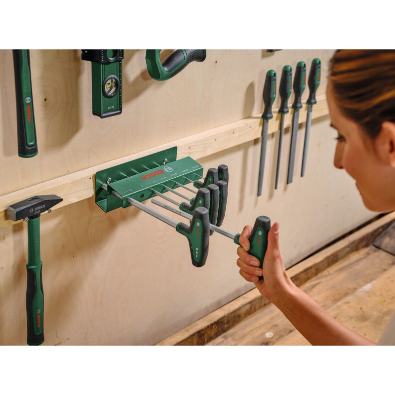 A Bosch 7 részes, T-fogantyús hatlapfejű csavarhúzókat tartalmazó készlete fokozott kényelmet és rugalmasságot biztosít az otthoni és lakásfelújítási feladatok elvégzéséhez. Minden T-fogantyús hatlapfejű csavarhúzó (HEX2, HEX3, HEX4, HEX5, HEX6, HEX8, HEX10) külön kategóriát képvisel az irányított és erőteljes rögzítéshez, még a nehezen hozzáférhető helyeken is – bútorok összeszerelésekor, motorkerékpárok és autók karbantartása során. Az ergonomikus, két alapanyagból készült T-fogantyú nagy felületű lágymarkolattal rendelkezik a kényelmes és hatékony erőátvitellel történő csavarozáshoz – a nagy nyomatékot igénylő feladatoknál is. Mindegyik T-fogantyús csavarhúzó kategóriájában a legjobb, S2 acélból készült szárral rendelkezik (56–60 HRC). A rendkívül hosszú szárak megkönnyítik a szűk, nehezen elérhető helyeken történő precíz munkavégzést. A fogantyún található felhasználóbarát méretjelzéseknek köszönhetően minden munkához egyszerűen kiválasztható a megfelelő csavarhúzó. A T-fogantyús csavarhúzók rendszerezve, fémrekeszben találhatók, amely álló helyzetben és falra szerelve is tárolható.