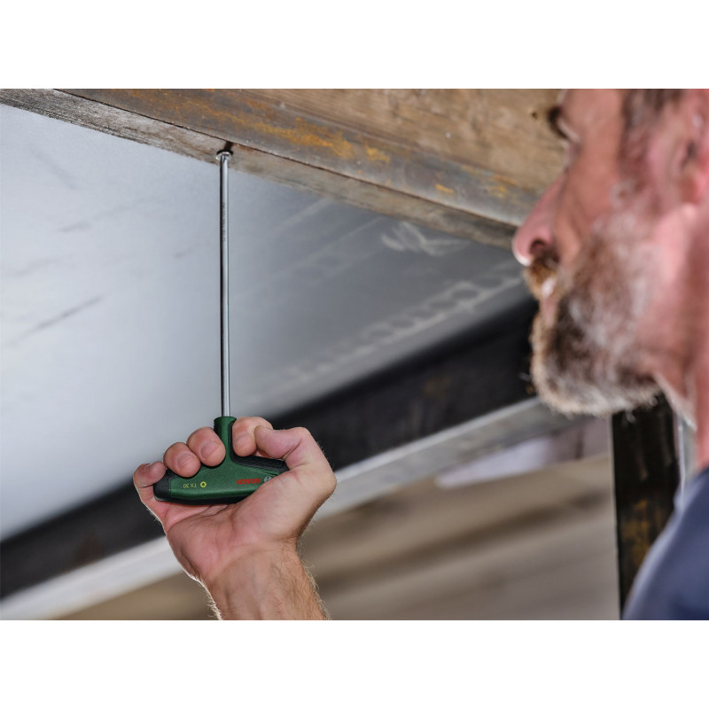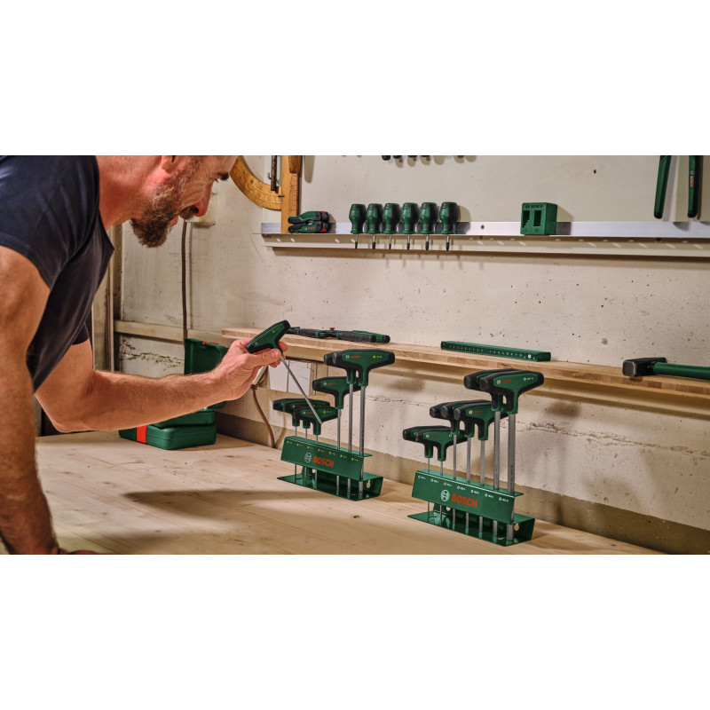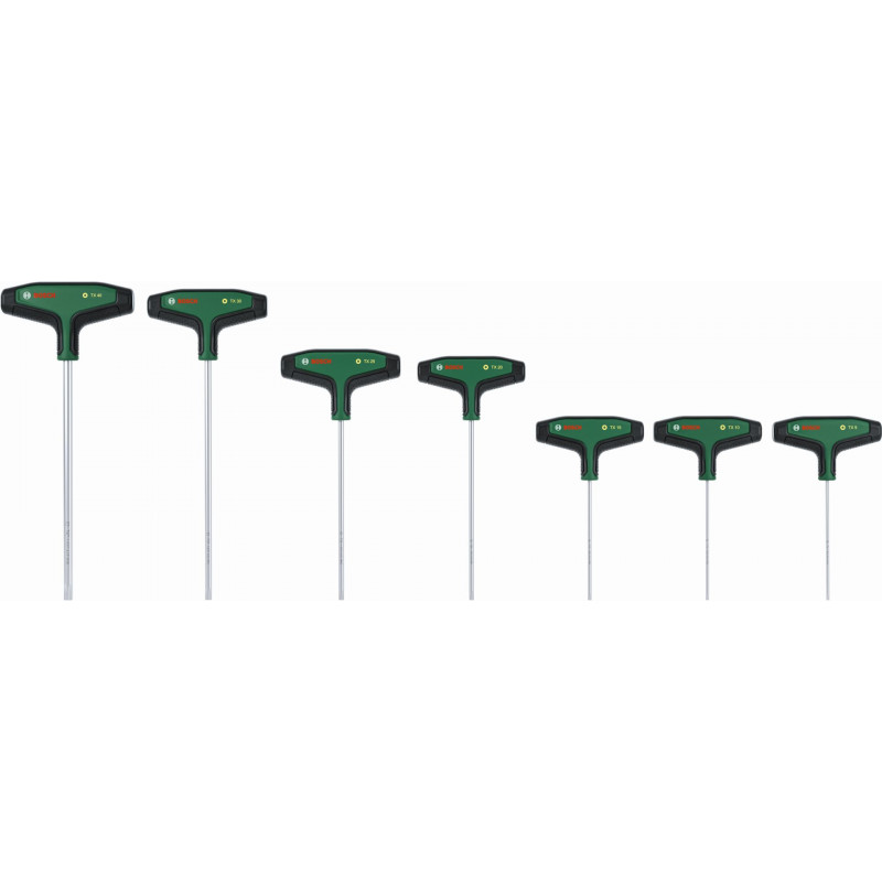 A Bosch 7 részes, T-fogantyús torx csavarhúzókat tartalmazó készlete fokozott kényelmet és rugalmasságot biztosít az otthoni és lakásfelújítási feladatok elvégzéséhez. Minden T-markolatú torx csavarhúzó (TX9, TX10, TX15, TX20, TX25, TX30, TX40) külön kategóriát képvisel az irányított és erőteljes rögzítéshez, még a nehezen hozzáférhető helyeken is – bútorok összeszerelésekor, illetve kerékpárok, motorkerékpárok és autók karbantartása során. Az ergonomikus, két alapanyagból készült T-fogantyú nagy felületű lágymarkolattal rendelkezik a kényelmes és hatékony erőátvitellel történő csavarozáshoz – a nagy nyomatékot igénylő feladatoknál is. Mindegyik T-fogantyús csavarhúzó kategóriájában a legjobb, S2 acélból készült szárral rendelkezik (56–60 HRC). A rendkívül hosszú szárak megkönnyítik a szűk, nehezen elérhető helyeken történő precíz munkavégzést. A fogantyún található felhasználóbarát méretjelzéseknek köszönhetően minden munkához egyszerűen kiválasztható a megfelelő csavarhúzó. A T-fogantyús csavarhúzók rendszerezve, fémrekeszben találhatók, amely álló helyzetben és falra szerelve is tárolható.