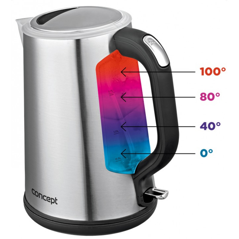 CONCEPT RK3200 vízforraló 1,7 l rk3200A Concept RK3200 Vízforraló exkluzív kiegészítője lesz konyhájának. Tökéletes választás, ha valami egyedire vágyik, hiszen ennek a vízforralónak a háttérvilágítása változtatja a színét. 1,7 literes űrtartalma lehetővé teszi, hogy egyszerre több személynek is forraljon vizet a reggeli kávéhoz, teához