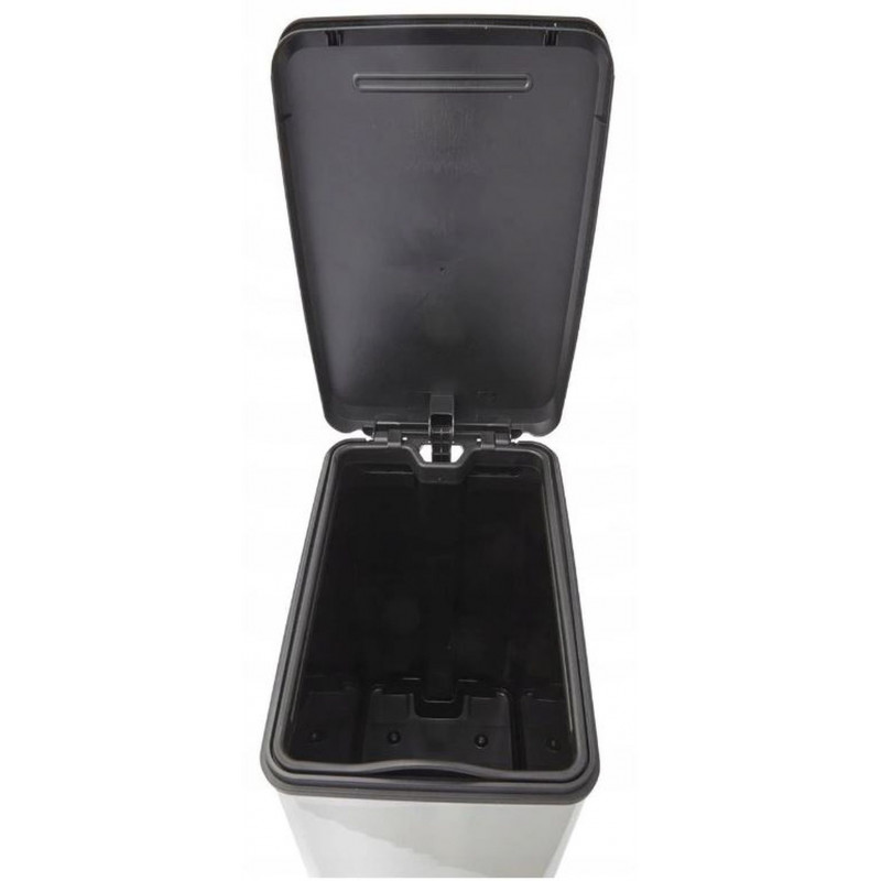 Funkcionális szemetes a fürdőszoba vagy a konyha könnyebb tisztántartása eléréséért. Tökéletesen illik a modern kialakítású fürdőszobákba és konyhákba. Kíváló minőségű műanyagból készült, valamint a metálfény fólia bevonat biztosítja a fém érzetet, de mégis könnyű marad. A hulladéktároló nyitása lábbal, egy speciális pedállal történik, így a kezek tiszták maradnak. A fedél szerkezete biztosítja a kosár tartalmának folyamatosan elzárt és láthatatlan tárolását. A vékony forma megkönnyíti a szemetes esztétikus elhelyezését a belső terekben.