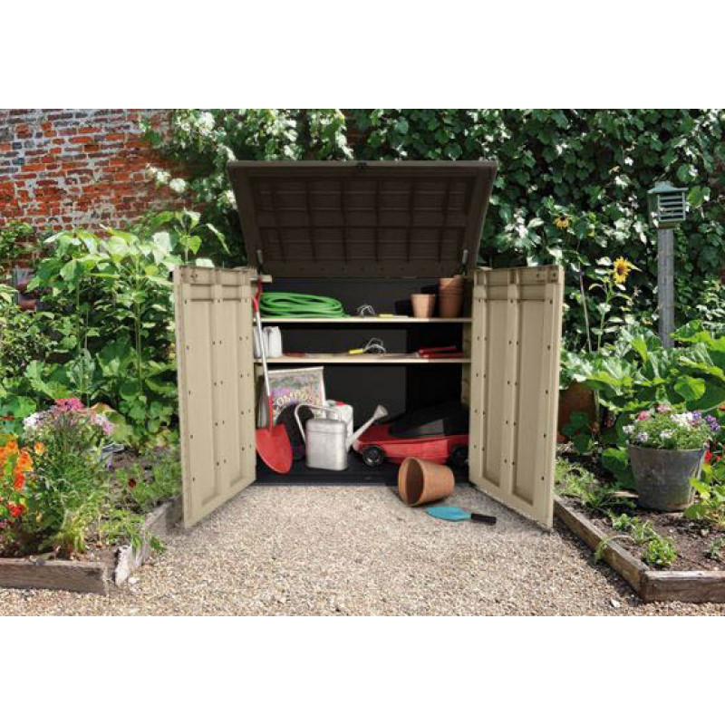 Az univerzális STORE-IT-OUT ARC tároló egy optimális megoldás a kerti készülékek, tartozékok és szerszámok, valamint a különböző fajtájú otthoni használati tárgyak tárolására. Az optimális méretek és a vízszintes szerkezet lehetővé teszik a termék legjobb elhelyezését. Magas minőségű anyagokból készült, hatékonyan megvédi a benne tárolt tárgyakat a légköri tényezőktől, szennyeződéstől és a nedvességtől. Az egyszerű és elegáns dizájn, az univerzális színválaszték és a természetes fára emlékeztető felület garantálja a termék ideális elhelyezését a meglévő térkialakításba. Opcionálisan a polcok beszerelése tovább növeli a termék használati tulajdonságait.