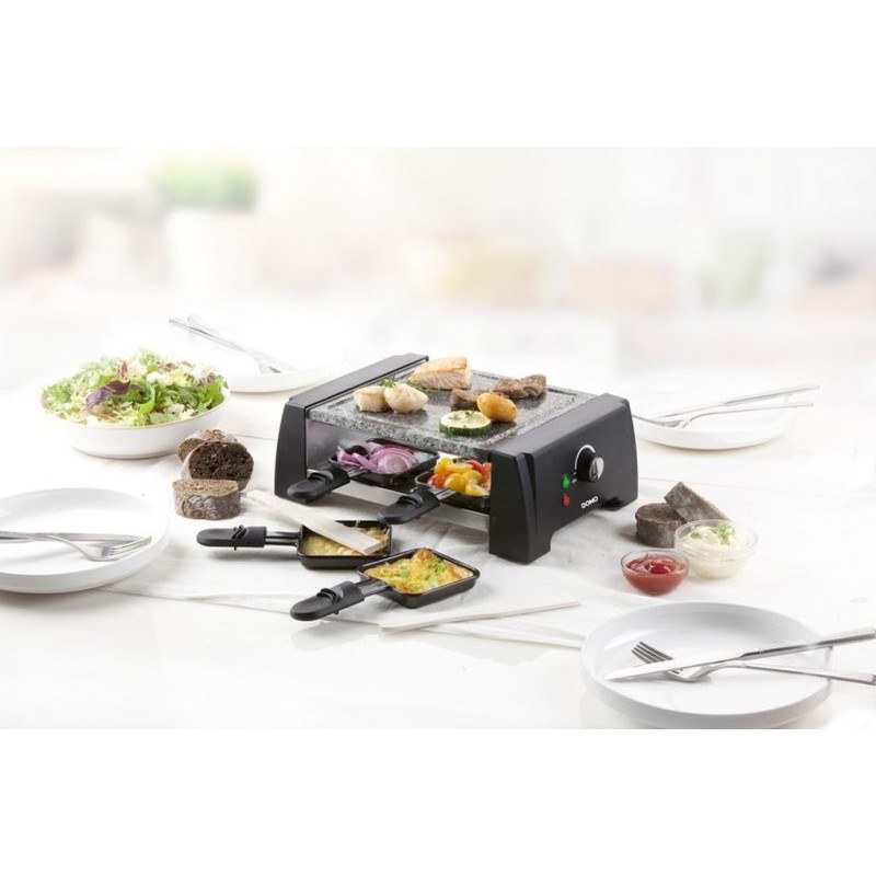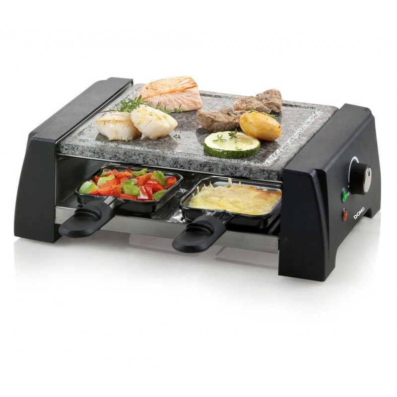 A Domo asztali grill és raklett sütőjével otthonában, a teraszon vagy a lakásban is grillezhet. Cserélhető grill felületének köszönhetően egyik fém-grill, míg a másik csiszolt kőgrill. Alul a raklett serpenyőkben pedig sajtokat zöldségeket grillezhet köretnek.