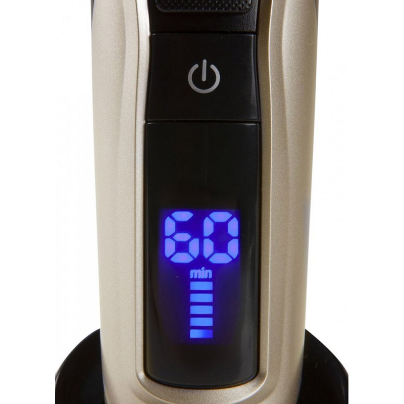 Vezeték nélküli haj- és szakállvágó Li-Ion akkumulátorral. Egyetlen feltöltéssel akár 60 perc üzemidő. Lemerült akkumulátor esetén is használható hálózatra csatlakoztatva. Professzionális eredményt és pontos vágást biztosít az acélból készült, titán bevonatú vágófej és mozgó kerámia penge. A vágási hossz közvetlenül a készüléken állítható 0,5 mm-es lépésekben 0,5–2,5 mm között, vagy használhatók klasszikus fésűs feltétek, illetve ritkító fésű. A hátralévő akkumulátoridő percekben megjelenik a jól látható LED kijelzőn. Töltés közben a készülék a csomagban található töltőállványra helyezhető.