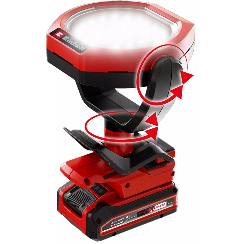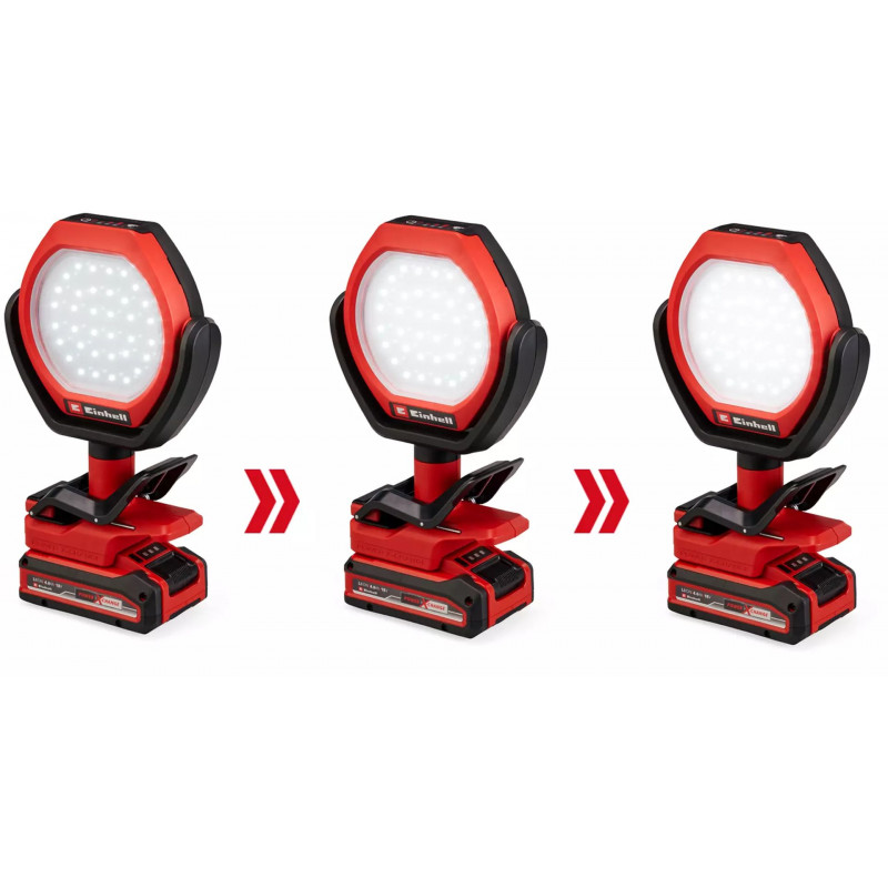 Az Einhell GC-OL 18/1500 Li-Solo akkumulátoros kültéri lámpa feje max. 300°-ban dönthető lefelé és felfelé, illetve előre és hátra. Ha rögzíti, akkor akár a padló vagy a mennyezet megvilágítására is használható.