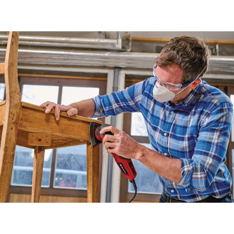 Az Einhell TC-DS 20 E deltacsiszoló egy könnyen kezelhető, 200 W teljesítményű készülék, amelyet fa, műanyag és fém csiszolására terveztek. Ez a hosszú üzemidejű csiszoló nem hiányozhat egyetlen ezermester műhelyéből sem! A csiszolópapírok formája különösen a szegletekkel taglalt, nehezen hozzáférhető helyeken biztosít könnyű munkavégzést: a csiszolótalp – melynek mindhárom oldala 93 mm hosszú – 3 különböző pozícióba forgatható. A fordulatszám-szabályozó elektronika lehetővé teszi, hogy a készülék teljesítményét mindig a megmunkálandó anyag tulajdonságaihoz igazíthassa. Rezgőkör: 2 mm. Rezgéstartomány: 12 000 – 22 000 rezgés/perc. A tépőzáras rögzítésnek köszönhetően pillanatok alatt kicserélheti a csiszolópapírokat, és erősen rögzítheti őket a legkülönfélébb munkák elvégzéséhez. A könnyű munkavégzésről az ergonomikus kialakítás és a Softgrip felület gondoskodik. A deltacsiszolón lévő 36 mm átmérőjű adapterhez csatlakoztathat például egy Einhell száraz-nedves porszívót is: a munkaterület így mindig tiszta és rendezett lesz. A gyári csomagolás 9 darab csiszolópapírt (2x K60, 2x K120, 2x K240, 3x K400) tartalmaz, így akár már rögtön a kicsomagolást követően megkezdheti a munkát a készülékkel. A feltekert kábel rögzítésére szolgáló kábelcsíptetőnek köszönhetően a deltacsiszoló mindig rendezetten és biztonságosan tárolható.