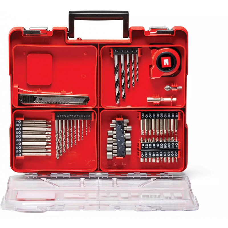 A készlet két darab 2,0 Ah Power X-Change akkumulátort és gyorstöltőt tartalmaz, így a munkavégzés azonnal megkezdhető. A 69 darabos tartozékkészlet különféle biteket, fúrószárakat, vágókést és mérőszalagot foglal magában. Az összes alkatrész egy praktikus szállító- és tárolókofferben kap helyet, amely megkönnyíti a rendszerezést és a szállítást.