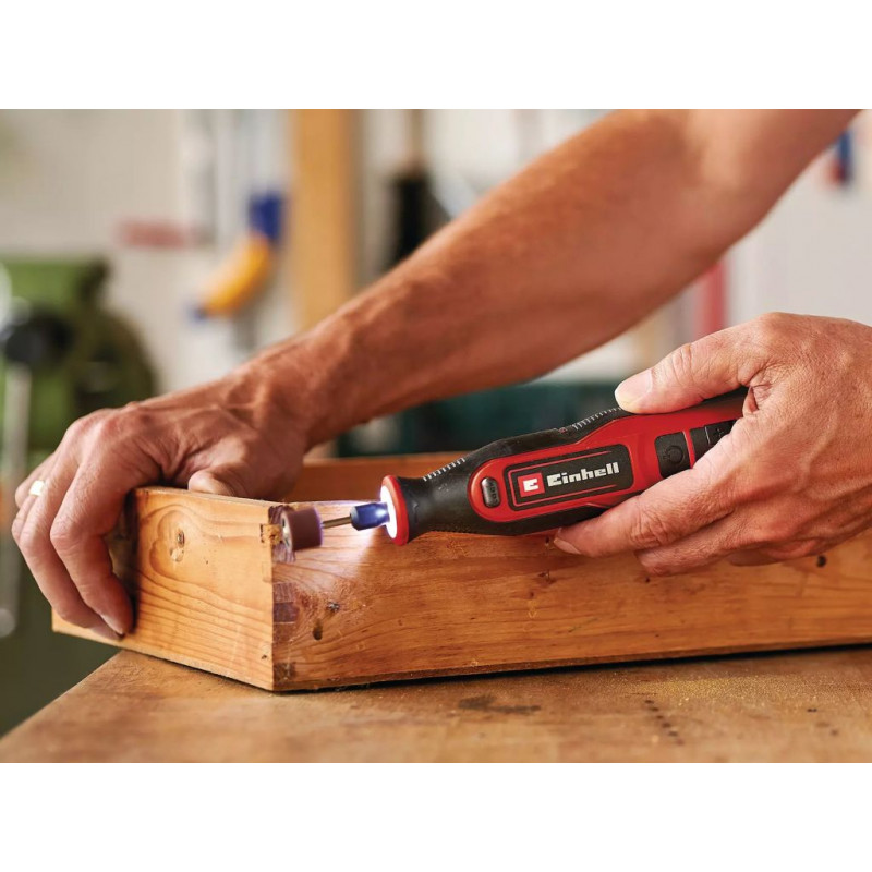 Az Einhell TE-MT 7,2 Li akkumulátoros csiszoló/gravírozóját gravírozási, marási, csiszolási munkákhoz és kefével történő tisztításhoz tervezték. Használja otthon, a műhelyben vagy a garázsban! A készülék gyári csomagolása tartalmazza a hosszú élettartamú akkumulátort (7,2 V | 1500 mAh). A LED-kijelzővel ellátott fordulatszám-szabályozó elektronika lehetővé teszi, hogy mindig az elvégzendő feladat tulajdonságaihoz igazítsa a készülék fordulatszámát (5500-26 000 min^-1). A rögzítőgomb egyszerű és gyors szerszámcserét tesz lehetővé. A munkadarab optimális megvilágításáról a LED-körfény gondoskodik. A biztos tartást és a precíz munkavégzést az ergonomikus Softgrip borítású felületek garantálják. A csiszoló és gravírozó készülék mindig használatra kész a töltőállomásnak köszönhetően. Az univerzális felhasználás biztosítása érdekében a csiszoló/gravírozó készülék gyári csomagolása egy praktikus tárolódobozba helyezett, 57 részes tartozékkészletet is tartalmaz.