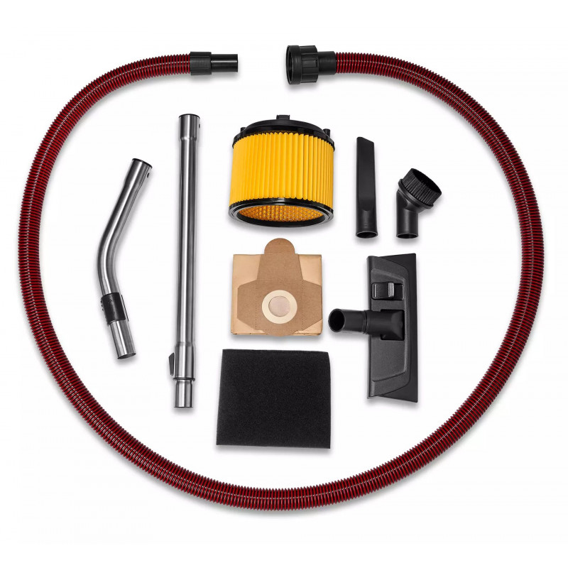A padlótisztító fej szőnyegek és sima padlók tisztítására alkalmas, a kárpittisztító szívófej autóülésekhez és kárpitozott bútorokhoz, a fugatisztító szívófej pedig szűk, nehezen hozzáférhető helyek tisztítására használható. A redős szűrőbetét, a szárazporszívózáshoz használható porzsák és a folyadékok felszívásához nélkülözhetetlen habszűrő szériatartozék. A porszívó két 18 V akkumulátorral üzemeltethető (az akkuk nem szériatartozékok).