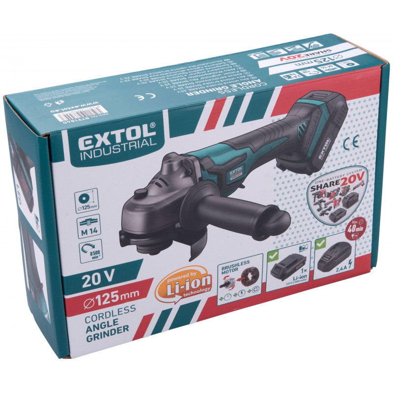 - Pro odeslání do Česka navštivte EXTOL INDUSTRIAL bruska úhlová aku SHARE20V, 125mm, BRUSHLESS, 20V Li-ion, 2000mAh 8791840