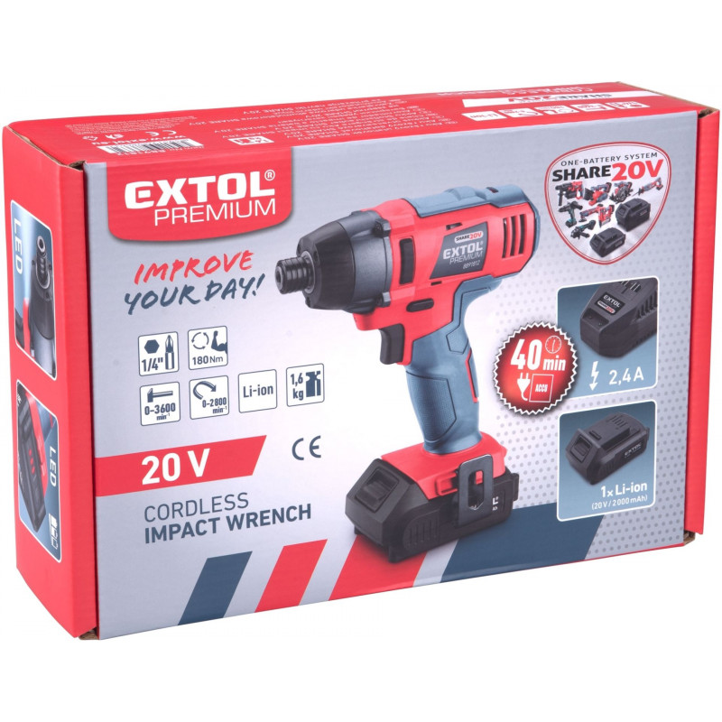 - Pro odeslání do Česka navštivte EXTOL PREMIUM utahovák rázový 1/4" aku SHARE20V, 20V Li-ion, 2000mAh 8891812