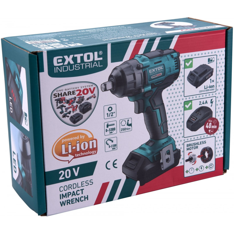 - Pro odeslání do Česka navštivte EXTOL INDUSTRIAL utahovák rázový 1/2“ aku SHARE20V,250Nm, BRUSHLESS,20V Li-ion,2000mAh 8791810