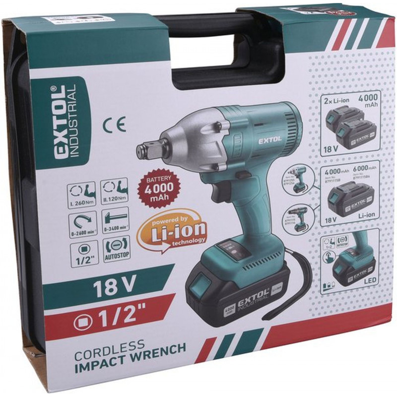 - Pro odeslání do Česka navštivte EXTOL INDUSTRIAL utahovák rázový aku 1/2", brushless, 18V Li-ion, 2x4000mAh 8791255