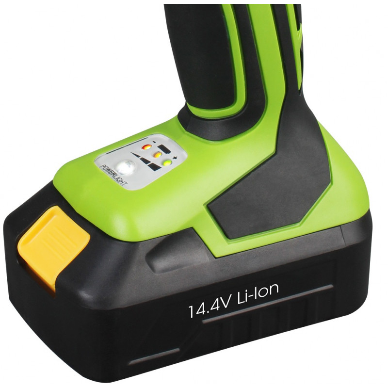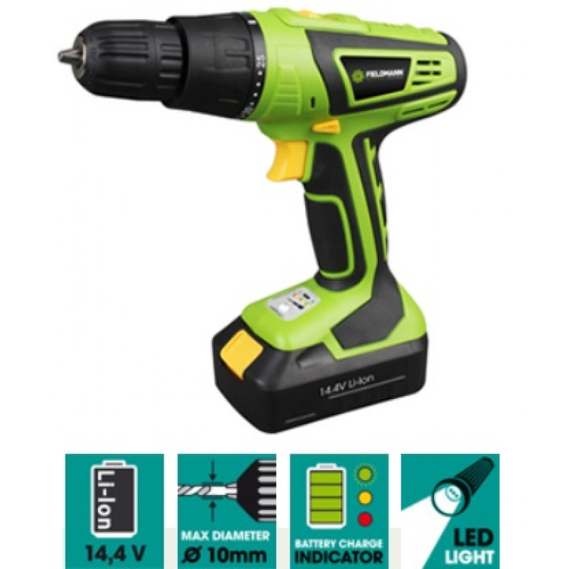 FIELDMANN FDV 1004-A akkumulátoros fúrógép 50001833Egy Fieldmann akkumulátoros fúró használatakor szinte minden munkaterület kényelmesen elérhető, hiszen nem határolja be azt a tápkábel hossza. Az áramellátásáról egy 14,4 V lítium-ion akkumulátor gondoskodik. A fúrógép az akkumulátorral felszerelve különösen könnyű és jól kiegyensúlyozott - ráadásul egy kényelmes, ergonomikus kialakítású markolat is segíti a könnyed használatot. A fúrógép gyorstokmánya legfeljebb 10mm fúrószár alkalmazását teszi lehetővé. Két sebességfokozat és 25+1 nyomatékszint áll rendelkezésünkre különféle csavarok és facsavarok rögzítéséhez.