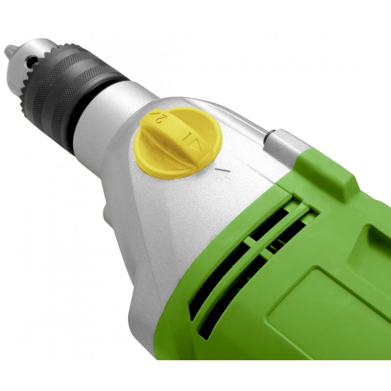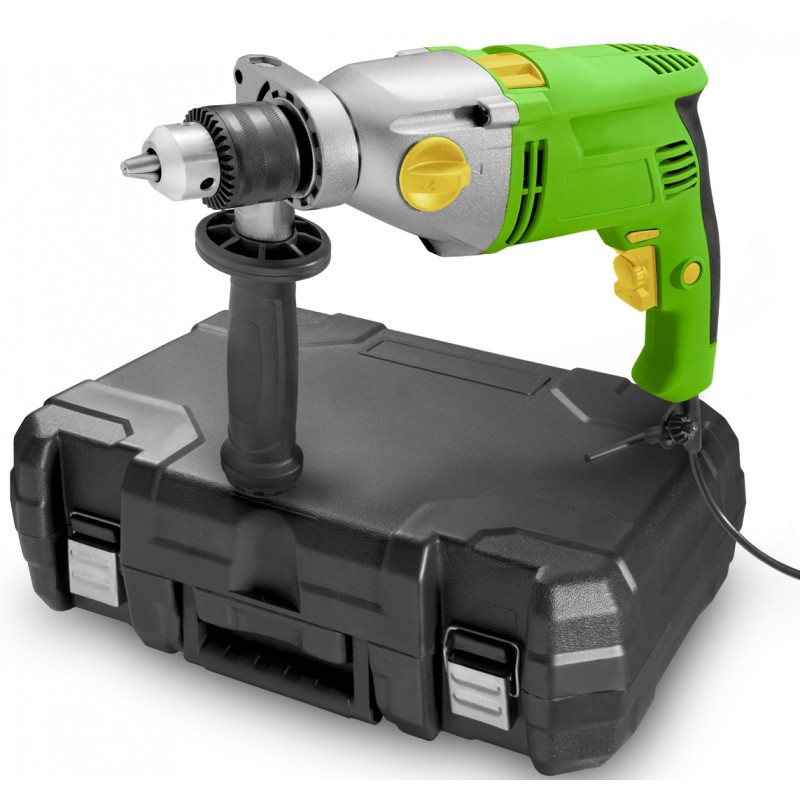FIELDMANN FDV 2003-E ütvefúró 50001569Az 1050 W teljesítményű, elektromos ütvefúró kitűnik ergonomikus kivitelével. A kényelmes és hatékony munkát két sebességfokozat biztosítja, mely fúráshoz és csavarozáshoz is megfelelő. A keményebb anyagok megmunkálásához akár 13mm fúrószár is használható a fúrógép kulccsal rögzíthető tokmányával. A percenként 0 - 2800 fordulatos sebességszabályzó fokozatos indulást biztosít a fúrógépnek, ezzel növelve a furat, illetve csavarozás pontosságát. A forgásirány átkapcsolás funkció elsősorban csavarok kitekeréséhez nyújt kiváló segítséget. Az ergonomikus oldalsó fogantyú jelentősen megkönnyíti az iránytartást - különösen ütvefúrás műveletéhez.