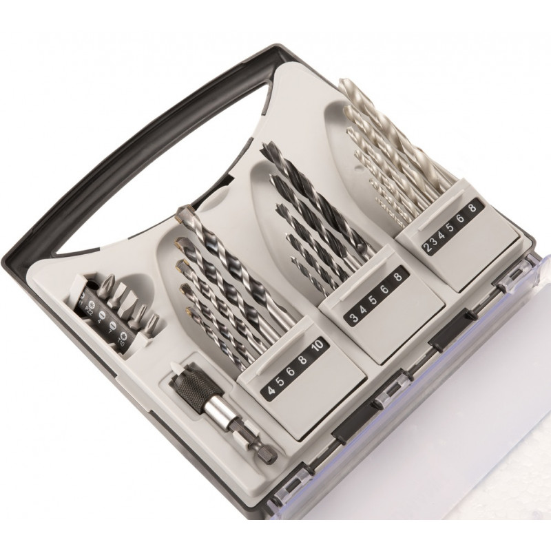 A PREMIUM fúrószár és bitkészlet többféle fúrási feladathoz kínál fúrószárakat: 6 fémfúró, 5 fafúró, illetve 5 beton és kőzetfúró áll rendelkezésünkre. A beton és kőzetfúrók segítségével többféle kemény anyag fúrása lehetséges - csak ne felejtsük el megfelelően lehűteni a fúrószárakat. A készlet emellett 6 sima és kereszthornyos csavarokhoz használható bitfejet kínál, melynek segítségével akár egy függönykarnist is kényelmesen szerelhetünk fel a magasban. A mellékelt forgófej még pontosabb csavarbetekerést tesz lehetővé. A csomag tartalma:5 db fali fúrószár: 4, 5, 6, 8, 10 mm