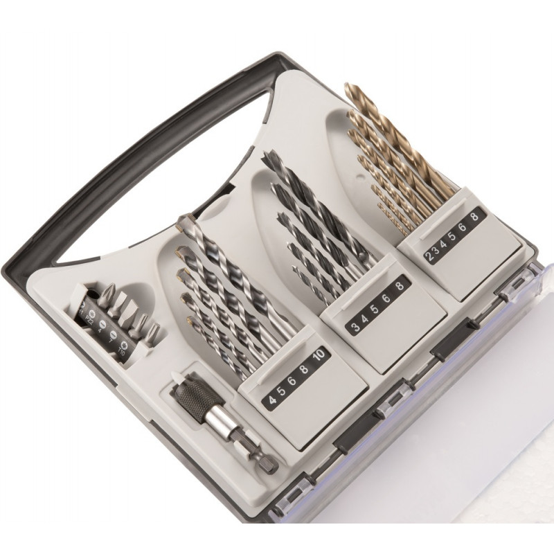 A COBALT fúrószár és bitkészlet többféle fúrási feladathoz kínál fúrószárakat: 6 fémfúró, 5 fafúró, illetve 5 beton és kőzetfúró áll rendelkezésünkre. A beton és kőzetfúrók segítségével többféle kemény anyag fúrása lehetséges - csak ne felejtsük el megfelelően lehűteni a fúrószárakat. A kobalt bevonat még ellenállóbbá és hosszabb életűvé teszi a fúrószárakat. A készlet emellett 6 sima és kereszthornyos csavarokhoz használható bitfejet kínál, melynek segítségével akár egy függönykarnist is kényelmesen szerelhetünk fel a magasban. A mellékelt forgófej még pontosabb csavarbetekerést tesz lehetővé. A csomag tartalma:5 db fali fúrószár: 4, 5, 6, 8, 10 mm