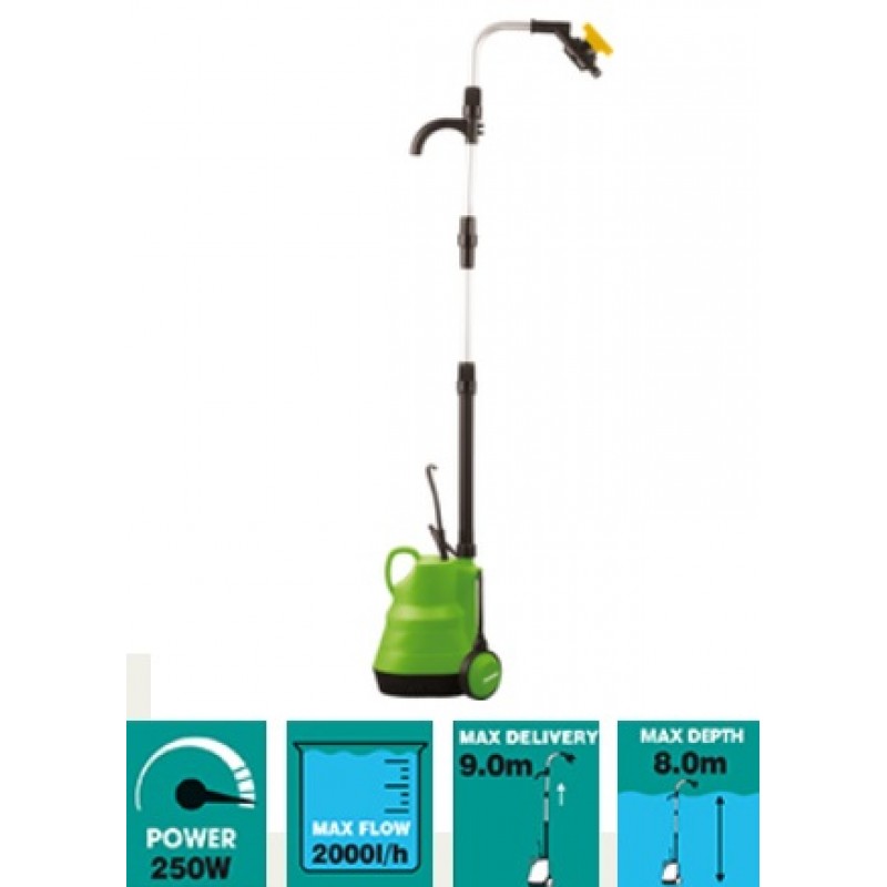 A praktikus és népszerű Fieldmann FVC 3002-ED merülő szivattyú leginkább eső és egyéb összegyűjtött víz kiszivattyúzására használható. Ezzel a megoldással nem szükséges, hogy nehéz locsolókannákkal végezze az öntözést. Egyszerűen és könnyen tud locsolni. Az FVC3002 működését biztosító villanymotor 250 W-os teljesítményfelvétele akár óránként 2 000 l folyadék szivattyúzását is lehetővé teszi. A búvárszivattyú maximális vízkiszorítása 9 m, a merülés maximális mélysége 8 m. A folyadék legfeljebb 3 mm átmérőjű szilárd anyagot tartalmazhat. Az FVC 3002ED úszókapcsolóval van ellátva. Egy kompakt akasztó segítségével, tegye a szivattyút a hordóba, így ez csak a kapcsoló szintje fölötti vizet tudja szivattyúzni. A beépített csap megakadályozza, hogy a víz kifolyjon spontán a gravitáció miatt, amikor a szivattyú ki van kapcsolva.