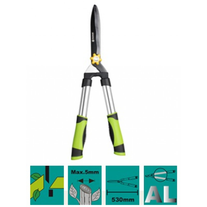 Sövényvágó akár 5mm vastag gallyak egyszerű levágásához. Kifejezetten kényelmes használat az egyenként 530mm hosszú nyélnek, valamint a könnyű, rövid, alumínium-ötvözet kivitelnek köszönhetően. A nedves kézzel is biztos fogást ergonomikus kialakítású, gumírozott fogantyúk biztosítják.