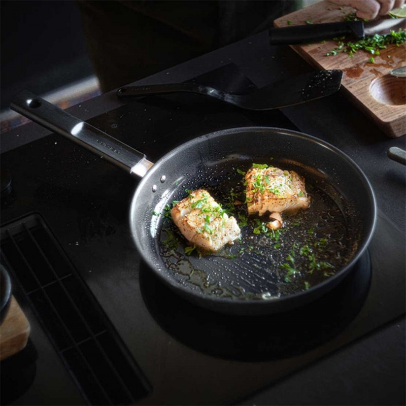 A Fiskars Hard Face Serpenyő 1075520 egy robusztus, 28 cm átmérőjű sütőeszköz, amelyet a mindennapi intenzív használathoz terveztek. Fő jellegzetessége a kiváló, tapadásmentes Ceratec™ Superior kerámia bevonat és a 100%-ban újrahasznosított alumínium test, mely gyors és hatékony hőelosztást biztosít minden tűzhelytípuson, beleértve az indukciót is.