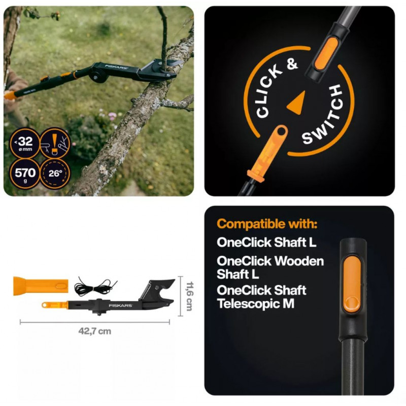A Fiskars OneClick Magassági ágvágó fej optimalizálja a magasban végzett kerti munkát, biztosítva a nehezen elérhető ágak biztonságos, gyors és hatékony metszését.