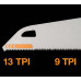 • A penge középső és sarki része 9 TPI-vel rendelkezik az erőteljes, sima vágáshoz minden fafajtán, valamint laminált anyagokon, PVC-n stb.