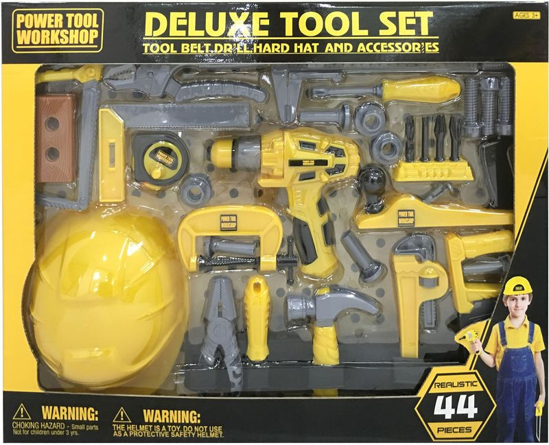 A készlet tartalmaz fúrót fúrófejekkel, kulcsokat, csavarokat, anyákat,kalapácsot, csavarhúzót,satut, fűrészt, fúráshoz alátétet, mérőeszközt,szögmérőt, tolómércét, csipeszt, védősisakot és még sok mást. Egyszóvalmindent, amire a műhelyben szükség lehet. A szerszámokkal való játékjavítja a gyerekek motorikus képességeit, türelmet tanulnak és közbenjókat szórakoznak.