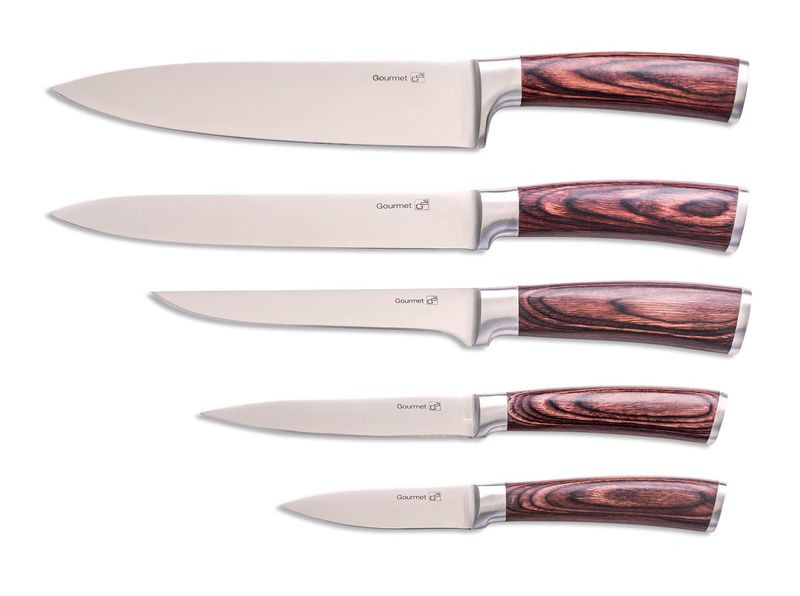 G21 Gourmet Dynamic 5 db-os késkészlet fekete rozsdamentes acél tartóval 60022163A Gourmet Dynamic kések pengéje minőségi 5CR15 acélból készül, melyet többek között vadászkések gyártásához is használnak. A felhasznált acélnak köszönhetően a penge éles, ellenálló és erős, megfelelő karbantartás mellett igen tartós, időtálló. A kés markolata extra erős és ellenálló, ún. Pakka Wood anyagból készül, mely gyártásánál a keményfa furnért hőkezelt gyantával impregnálják. Ennek eredménye a stabil és erős markolat, mely nem enged az idő múlásának. A szett része egy elegáns rozsdamentes acél tartó is fekete színben, amelyben minden késnek megvan a maga biztonságos helye.
