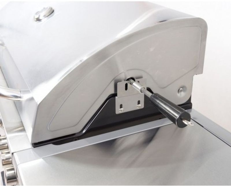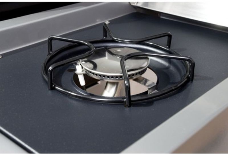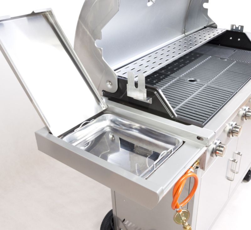 A grill egy csuklós fedéllelrendelkezik, mely lefedi az összeg égőt, továbbá az oldalán polcokkal amunka megkönnyítéséhez. A bal polc alatt egy tárolóedény van, amibebeleteheti pl. az előre bepácolt húst. A jobb polc alatt van az oldalsóégő. Az ajtók rozsdamentes acélból készültek.