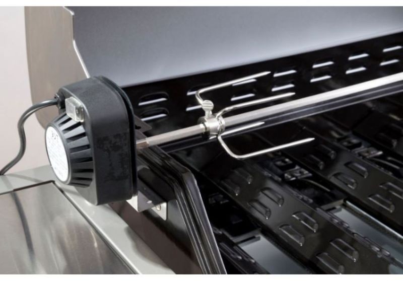 A másik oldalon a motor található szintén műanyag fedéllel, melyentalálható a ki-és bekapcsoló gomb. A 230 V motort egyszerűen csakcsatlakoztatni kell az áramkörbe a 125 cm-es tápkábellel. A motorsegítségével a nyárstű percenként kb. 2x fordul, így biztosítva azegyenletes sütést.