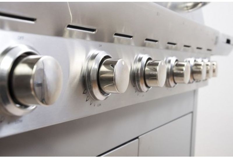 A G21 Mexico BBQ Premium Line gázgrill Flame Tamer funkcióval, 6 rozsdamentes acél főégővel + egy oldalsó égő elektromos gyújtással és gázszabályzóval rendelkezik.