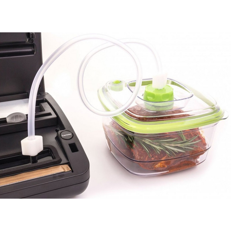 A A G21 Nefrit vákuumozó nemcsak vákuumzsákokból vagy fóliákból tudja kiszívni a levegőt, hanem a vákuumpácoló edényekből is. Csak csatlakoztassa a tömlőt a G21 vákuumpácoló edény nyílásához (a tömlő része a doboz csomagolásának) 1,4 vagy 2 literes térfogattal, nyomja meg a megfelelő vezérlőgombot, és a dobozban lévő levegő megbízhatóan kiürül.