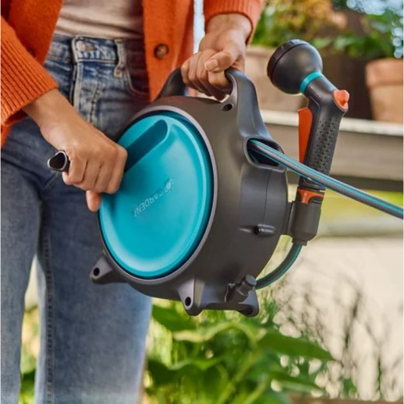 - Kényelmes tömlőfeltekerés – nagyméretű, összecsukható tekerőkarral.