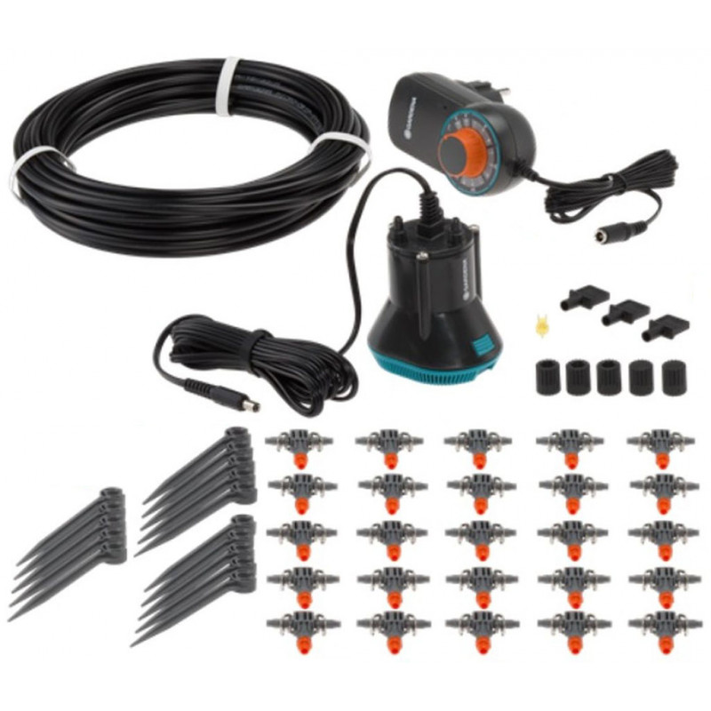 A készlet tartalmaz egy transzformátort forgógombbal az öntözési program kiválasztásához, 14 V-os alacsonyfeszültségű szivattyút, 25 sorcsepegtetőt kb. 2 l/óra vízhozammal, zárósapkával és tisztítótűvel, 10 méter 4.6 mm (3/16") elosztótömlőt, 15 tömlőtartót.