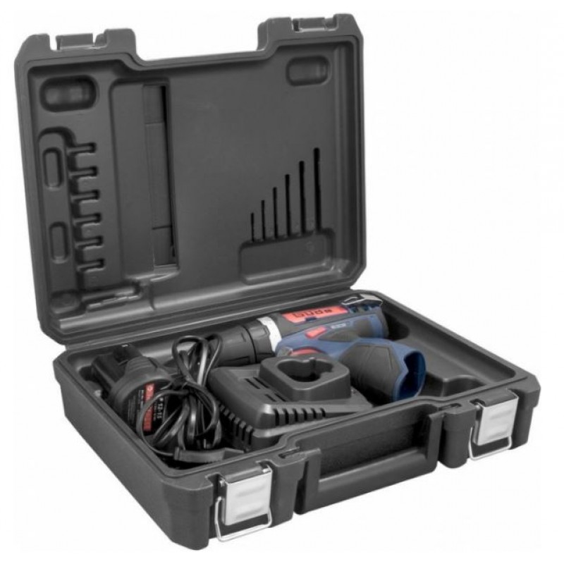 • Li-Ion akkumulátor 12 V/2,0 Ah; töltő 2,0 A/h; 6 részes fúrószár készlet (HSS; átm. 1,5-2,5-3,0-4,0-5,0-6,0 mm); 6 részes bitkészlet (Cr-V; átm. 5-6 mm, PH1, PH2, PZ1, PZ2); műanyag koffer
