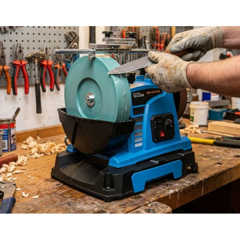 GÜDE GNS 250 DC VS egy nagy teljesítményű asztali vizes köszörű kések és szerszámok élezéséhez, amely pontos, kíméletes és kontrollált élezést tesz lehetővé a penge túlmelegedése nélkül. Ez az alacsony fordulatszámú, vízhűtéses köszörű Vario-Speed fordulatszám-szabályozással és kapcsolható forgásiránnyal rendelkezik, így ideális kések, fejszék, vésők, gyaluk és egyéb vágószerszámok élezéséhez.