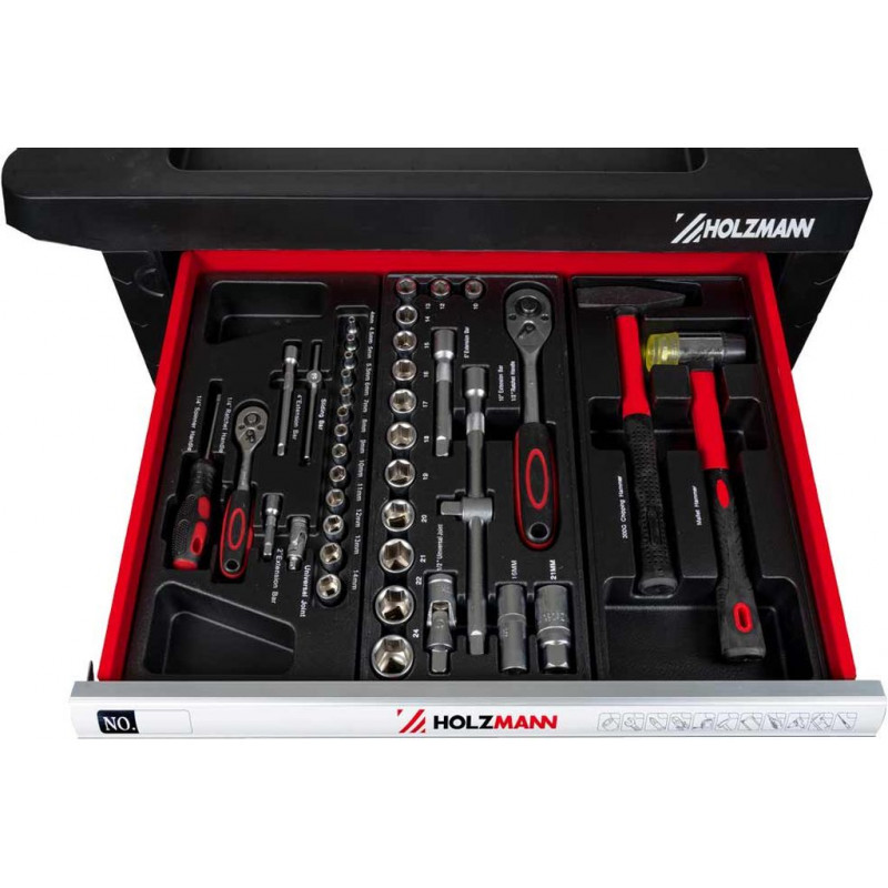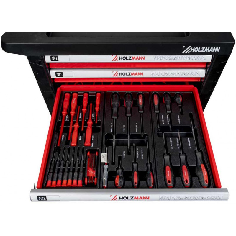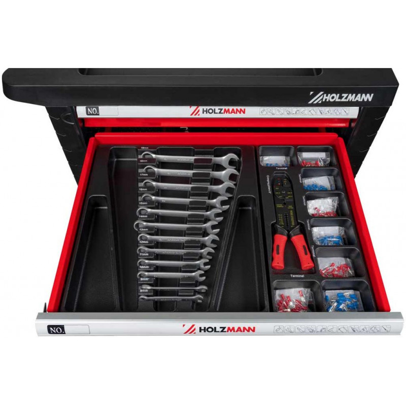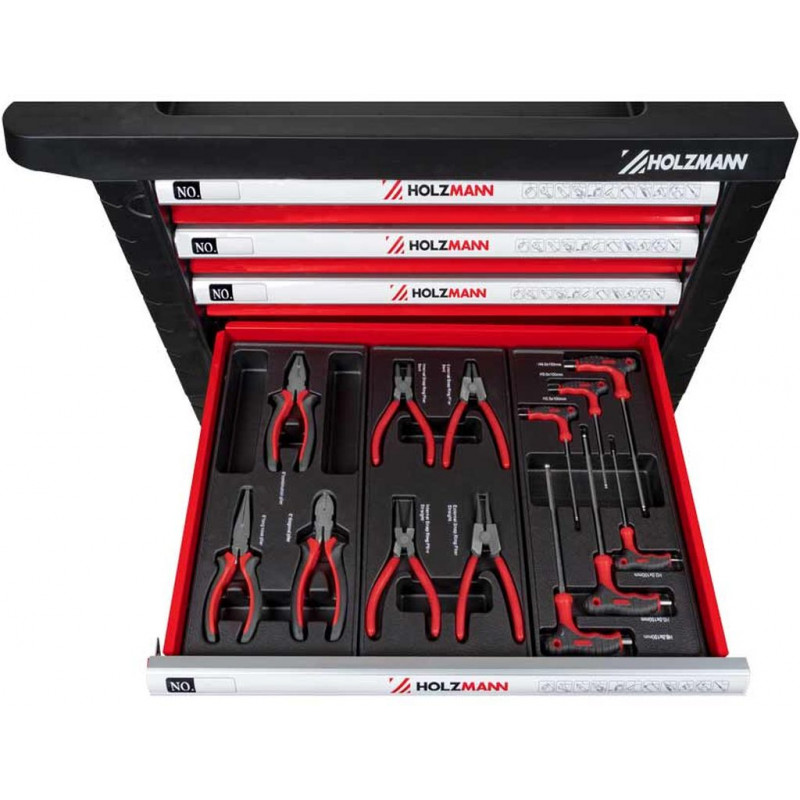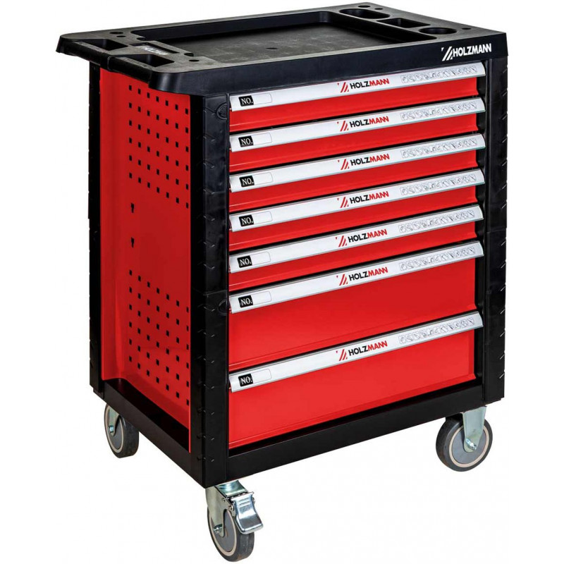 A HOLZMANN WW770W műhelykocsi komplett és praktikus megoldást kínál minden műhely számára. Hét fiókkal rendelkezik két különböző méretben, amelyek golyóscsapágyas kivitelüknek köszönhetően sima és csendes működést biztosítanak, valamint elegendő helyet nyújtanak a szerszámok áttekinthető rendszerezéséhez.