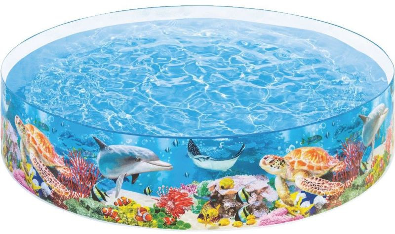 Merevfalú medence (vízzel feltöltve, annak nyomása feszíti a medence oldalait) vidám tengeri mintával.A medence mérete: 244×46 cm,