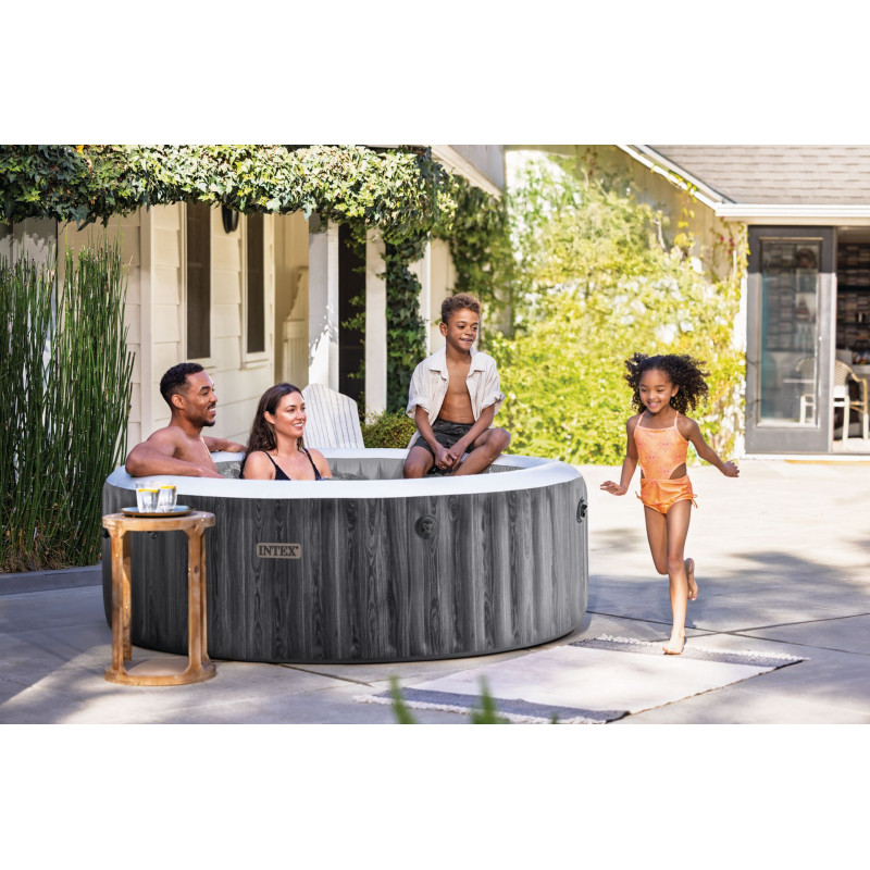 Stílusos INTEX PureSpa Greywood Bubble Deluxe felfújható jakuzzi modern szürke fa hatású dizájnnal a megjelenés és a kikapcsolódás tökéletes kombinációját kínálja. Ez a 4 személyes jakuzzi erőteljes pezsgőrendszerrel, fejlett vízkezelési technológiával és kényelmes mobilalkalmazásos vezérléssel rendelkezik. Hozza létre saját wellness zónáját, és élvezze a maximális pihenést otthonában.