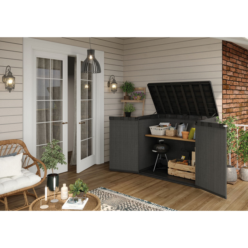 A kerti láda biztonsági zárszerkezettel van ellátva, amely hatékony védelmet biztosít az illetéktelen hozzáférés ellen. A beépített szellőzőrendszer ideális tárolási környezetet teremt, megóvva a tárgyakat a nedvességtől és az időjárás káros hatásaitól. Így még a legérzékenyebb eszközök és tárgyak is hosszú távon kifogástalan állapotban maradnak. A dupla ajtóknak és a nyitható tetőnek köszönhetően gyorsan és kényelmesen pakolhatsz be és ki. Az egyszerű összeszerelés pedig igazi élménnyé teszi a használatát: felesleges erőfeszítések és bonyodalmak nélkül.