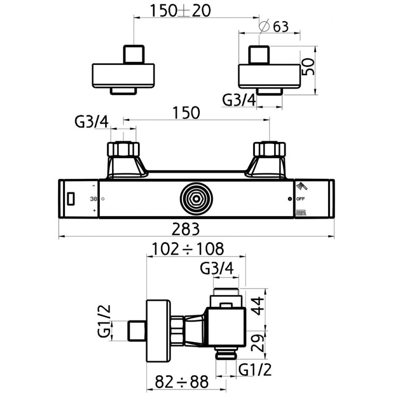 NOVASERVIS AQUASAVE SHOWER THERMOSTATIC MIXER WITH UPPER AND LOWER OUTLET,150MM 2862/1,0