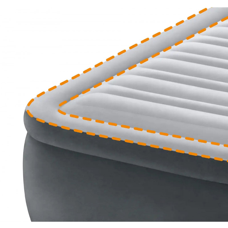 Az INTEX Comfort-Plush Elevated felfújható ágy úgy lett kialakítva, hogy maximális kényelmet biztosítson alvás közben. A belső szerkezetben található több ezer erős poliészter szál megtartja az ágy formáját és optimális testtámaszt nyújt, míg a puha velúr felület kellemes érzetet biztosít. A megerősített szerkezet, a vízszintes légkamrák és a stabil peremek hozzájárulnak a kiváló stabilitáshoz és a hosszú élettartamhoz, besüllyedés nélkül. A beépített QuickFill® elektromos pumpa (220–240V) lehetővé teszi a gyors felfújást és leeresztést körülbelül 4 perc alatt, így az ágy azonnal használatra kész, és összecsukva minimális helyet foglal.
